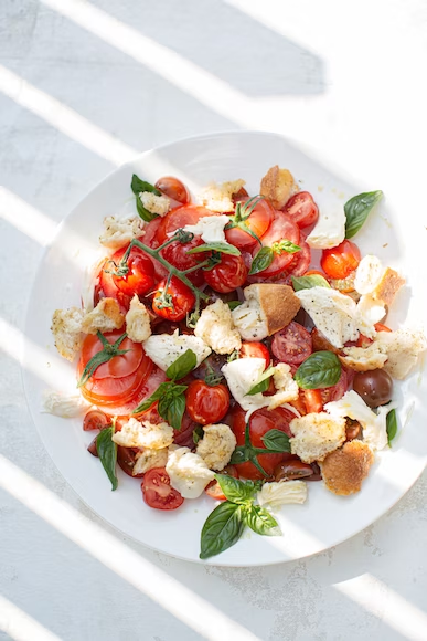 and an array of vibrant veggies on a bed
